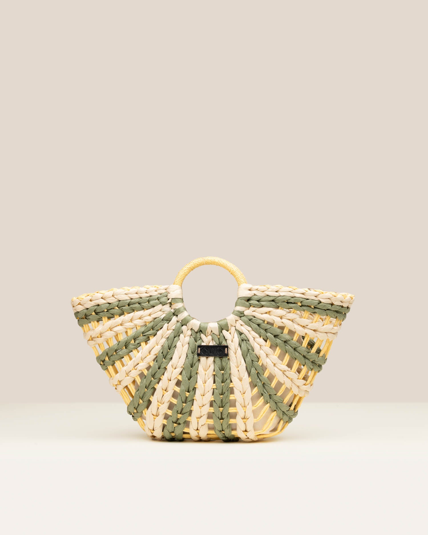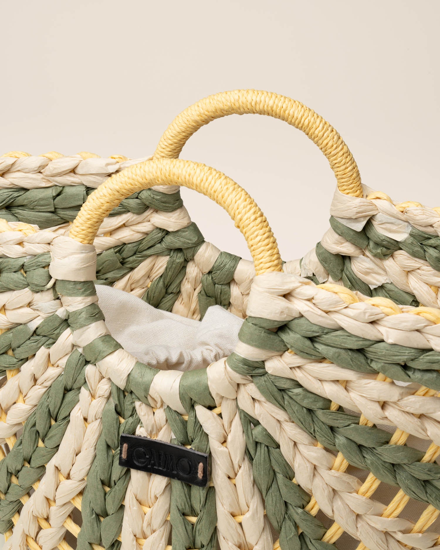 The Arnedo bag by Gaimo is a half-moon tote bag with multicolored braiding, a handle, and a cotton inner bag with adjustable drawstring closure. Its vibrant color combination and rigid structure make it the perfect accessory to enhance any summer look this season.