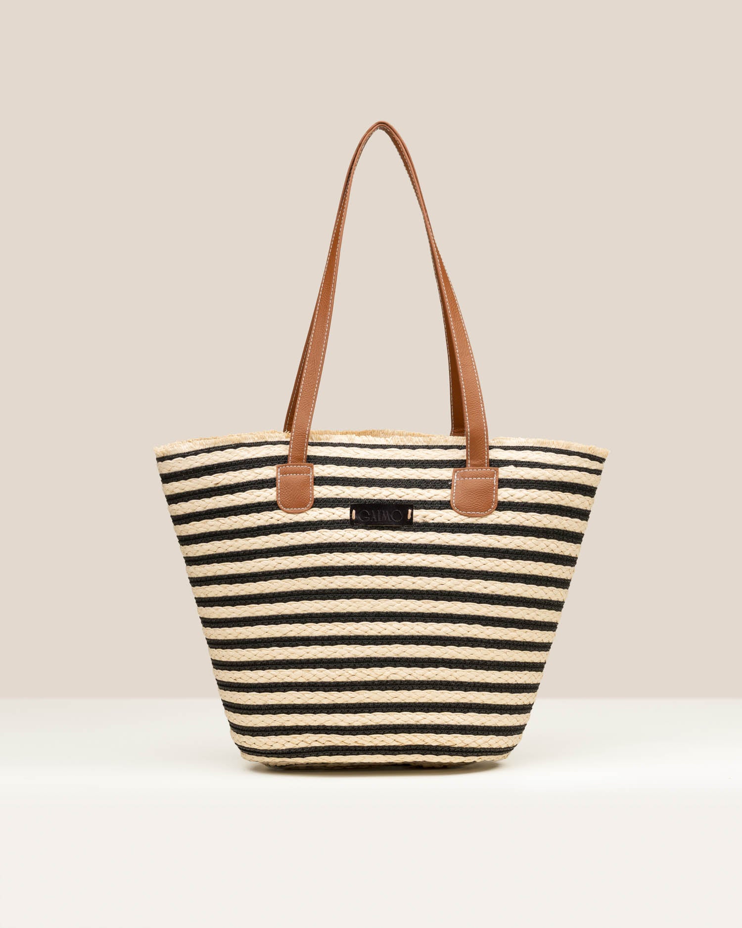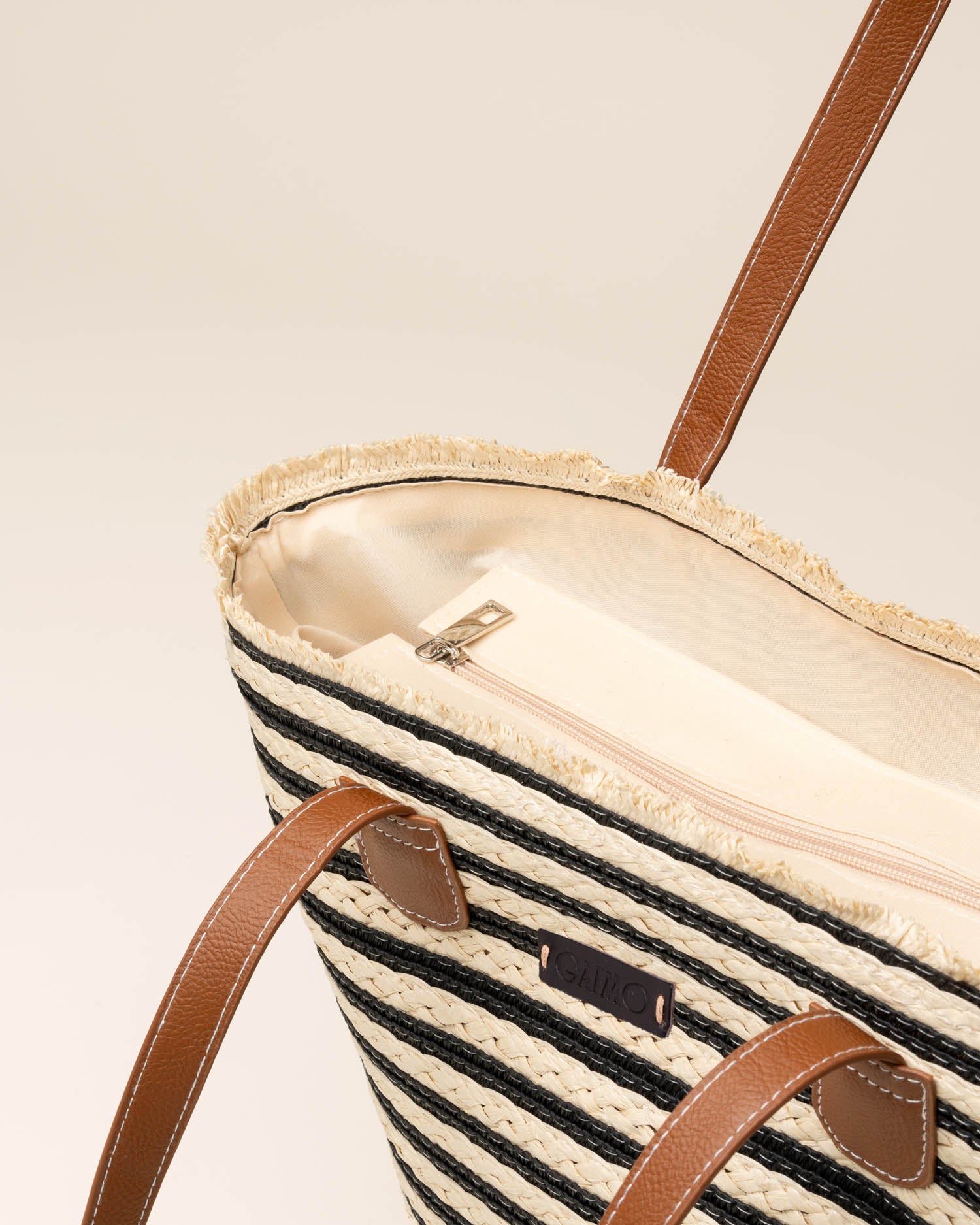 The Cameros bag by Gaimo is a shopper with a two-tone braided raffia design, creating a chic nautical-inspired effect. Featuring a central zipper closure and a comfortable long shoulder strap, it blends classic style with timeless appeal, perfect for any time of day.