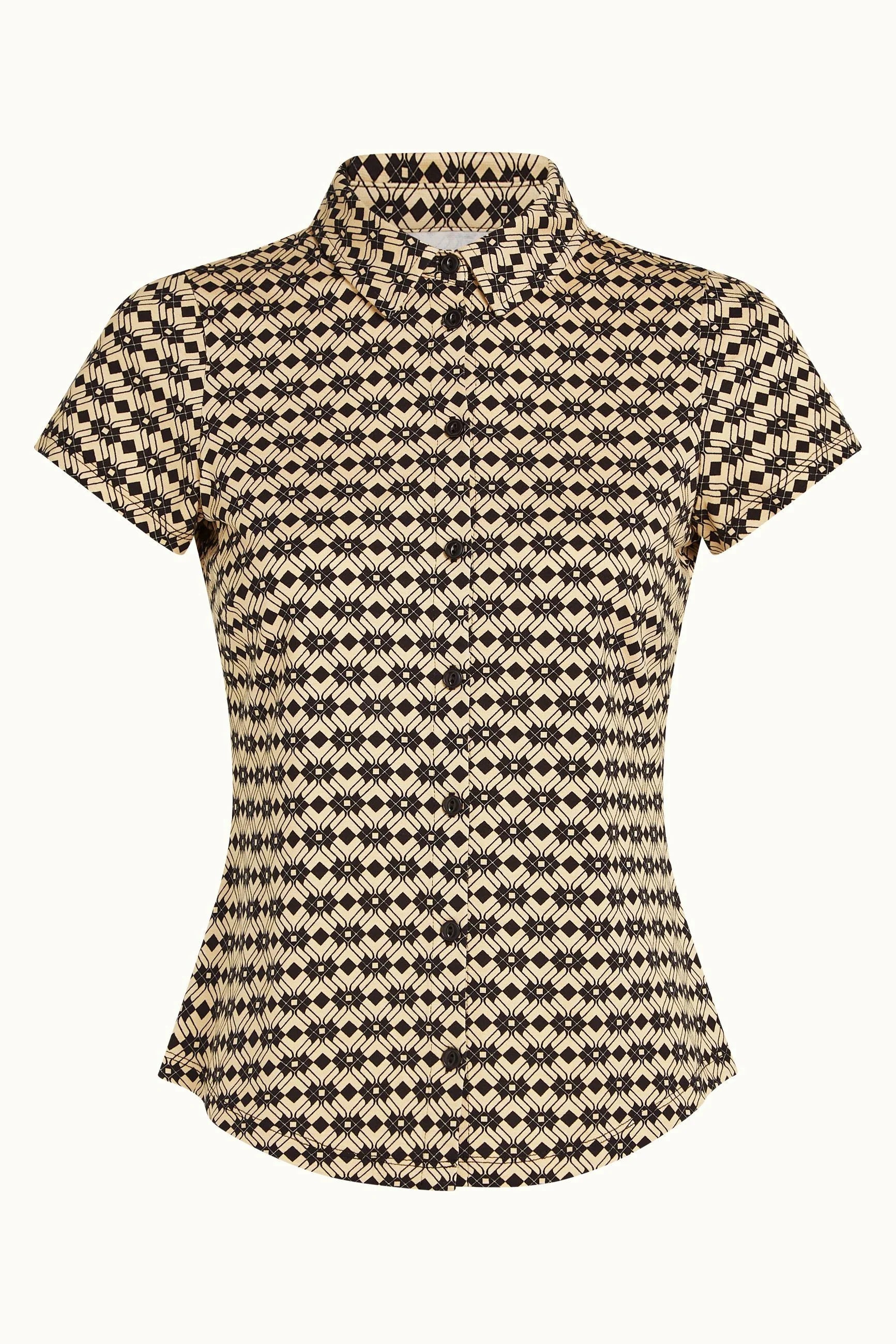King Louie with a cream and black print. This blouse features a collar and front button closure, is a flattering fitted style and is comprised of a comfortable stretch fabric with a graphic print all over.