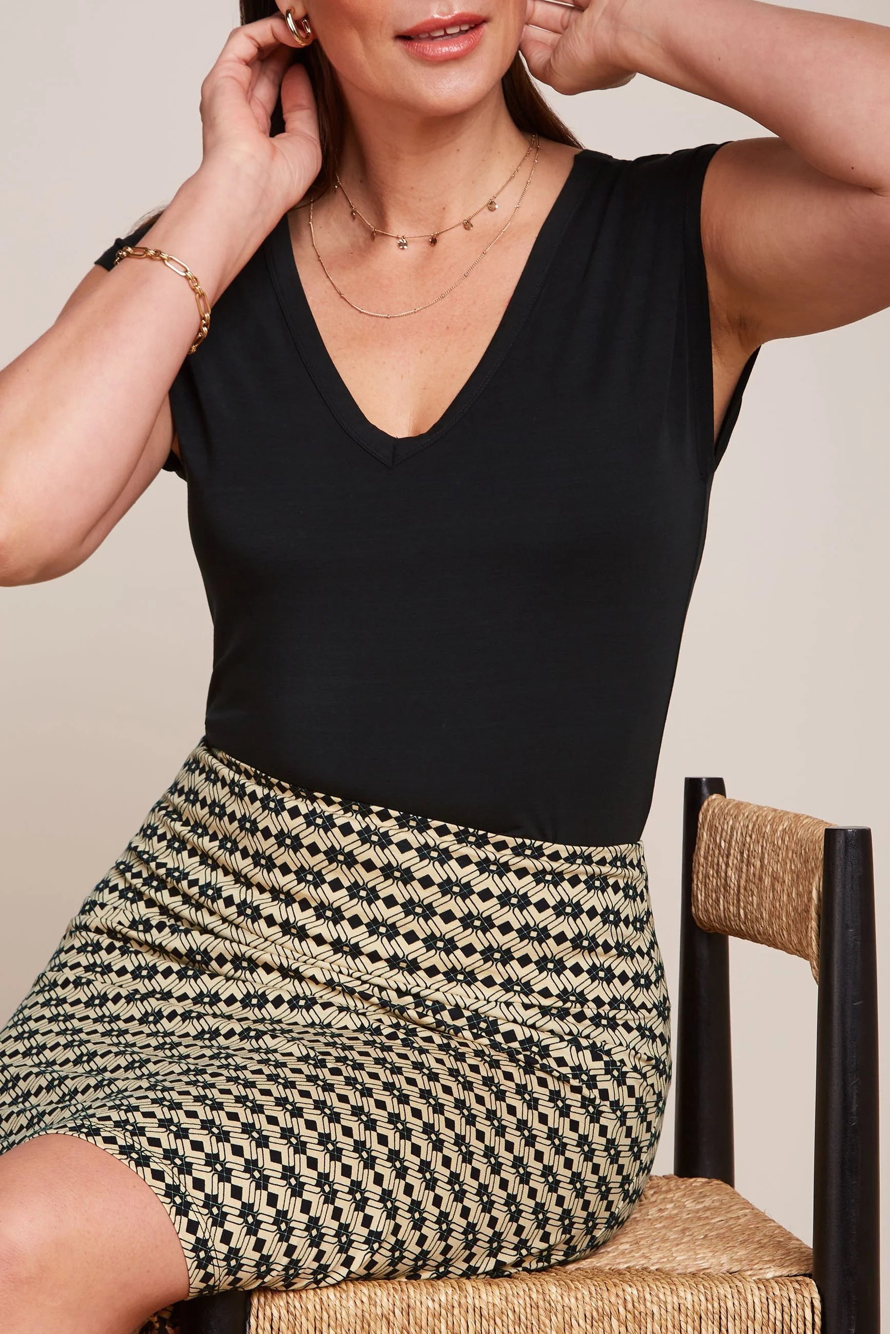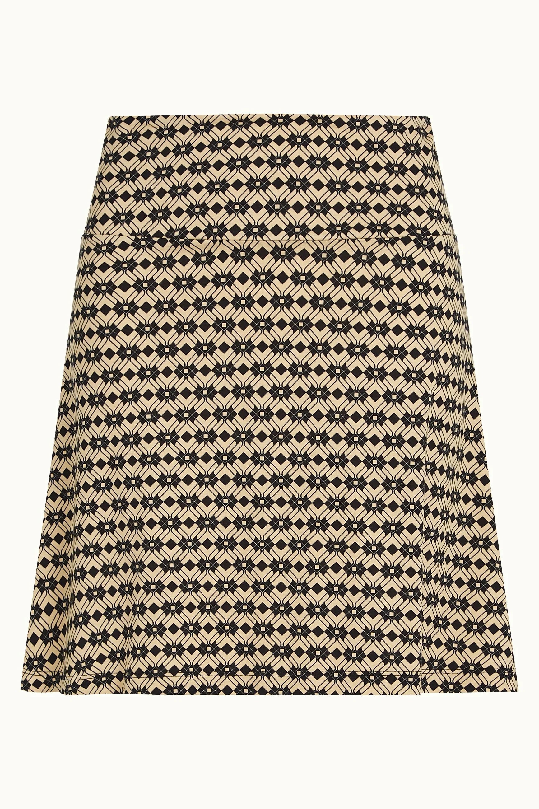 The Border Skirt by King Louie is a classic shape repeated each season in new colours and prints. Comprised of a soft jersey fabric, the skirt features a comfortable wide waistband and A line shape that finshes just above the knee. The design is a repeat geo print of black and cream.
