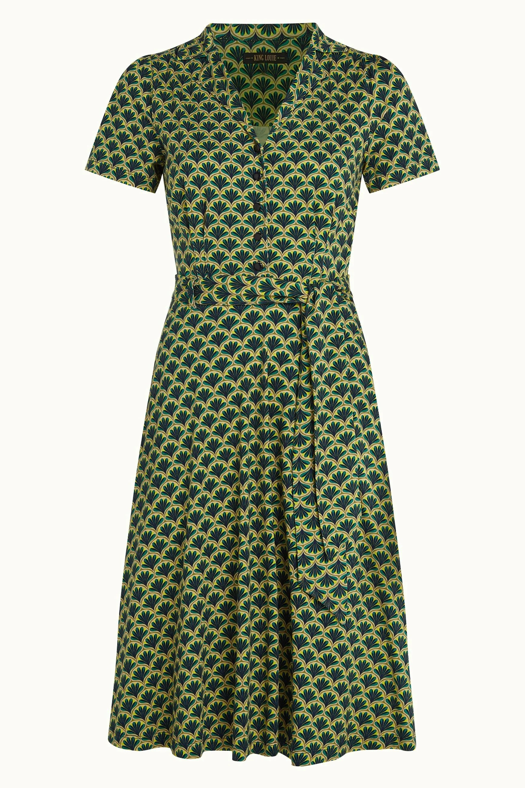 The Sheeva Midi Dress by King Louie is feminine and comfortable in a jersey fabric printed in a teal, green and black pattern. The dress has short sleeves, button closure, tie belt and V neck, the dress is made of a soft and stretchy viscose jersey which makes it very comfortable to wear.
