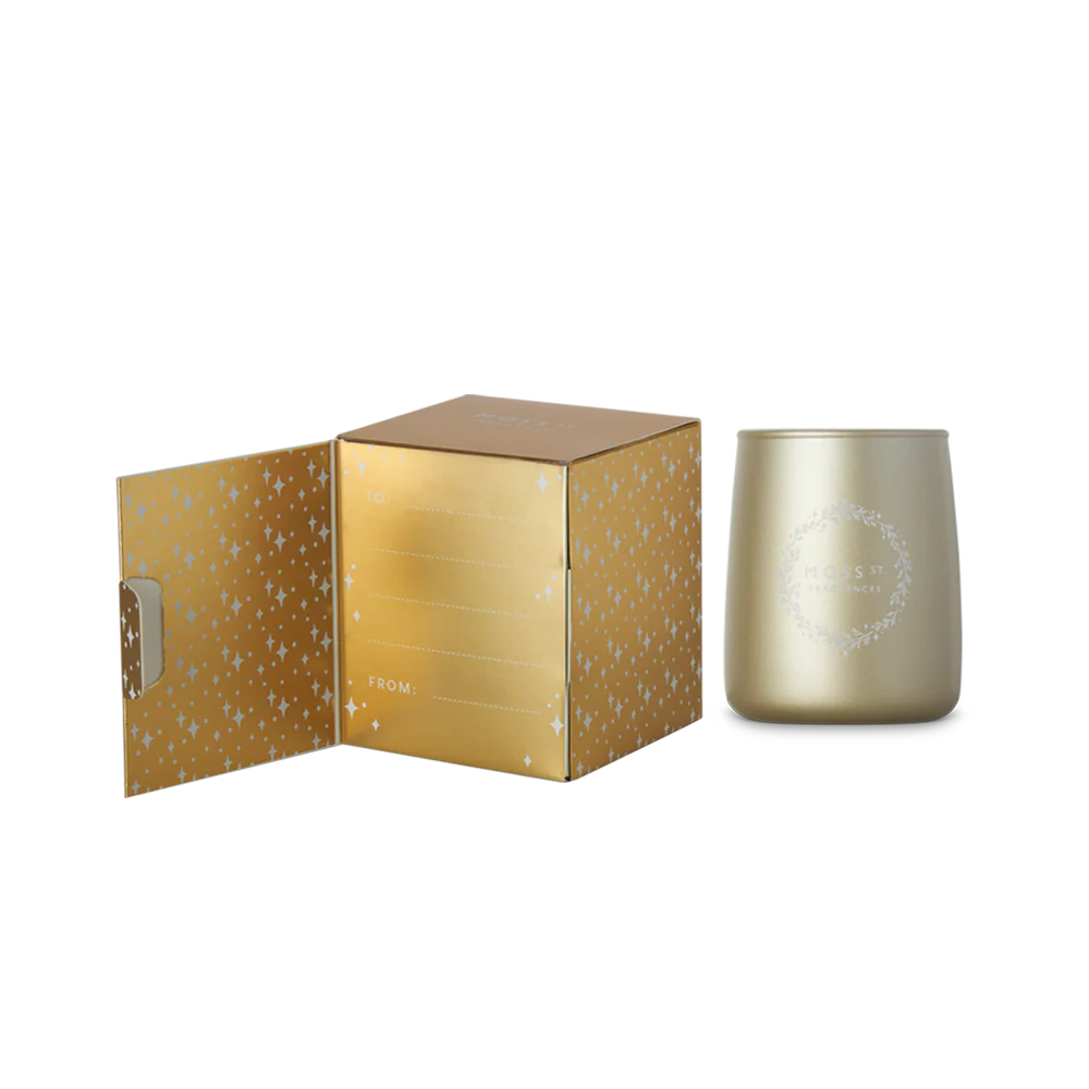 It's time to celebrate! Give a thoughtful gift with our Mini Candle Card, adorned with a festive wreath, luxe gold vessel and white interior. Simply open the card feature on the front of the box and write your own personalised message!