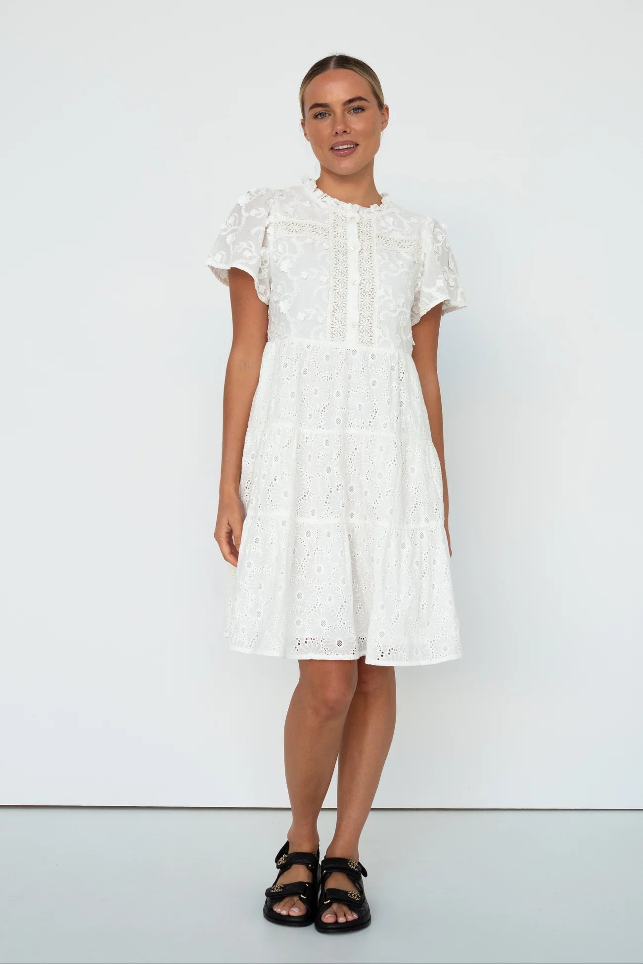 The detailed Camilla Dress features inlaid lace bands down the front, embroidery across the body and a broderie anglaise skirt that falls to just below the knee. Wear with a sandal or your favourite sneaker for that relaxed yet elevated look.