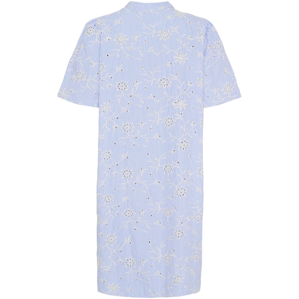 The Thalia Dress in Celeste by Marta du Chateau is the essence of summery lightness and feminine elegance. With its sky blue pinstripe, ivory embroidered flowers and airy fit, this dress is created for warm days, where comfort and style go hand in hand. The dress has a relaxed A-shape with short sleeves, a V-neck and fine ruching details, which give a soft fall and a flattering look. It is easy to style with sandals, sneakers or espadrilles - perfect for everything from everyday life to holidays.